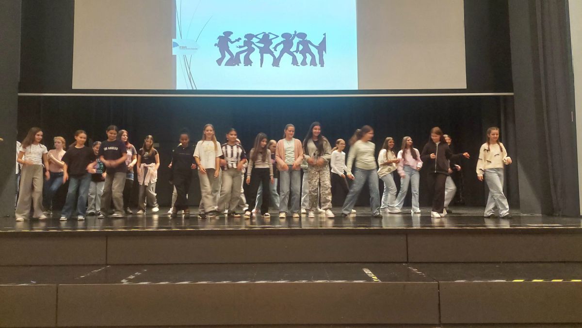 Viele erwartungsvolle und gespannte Gesichter konnte man an diesem Nachmittag in der Stadthalle beobachten. Während alle noch auf den offiziellen Beginn warteten, konnten die Neuankömmlinge schon den neuen Projektclip mit Musik anschauen. Das Gemurmel der Familien verstummte, als die sechsten Klassen unter der Leitung von Swantje Schlüter das Begrüßungsprogramm starteten.