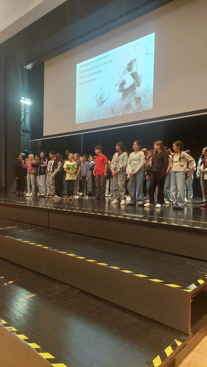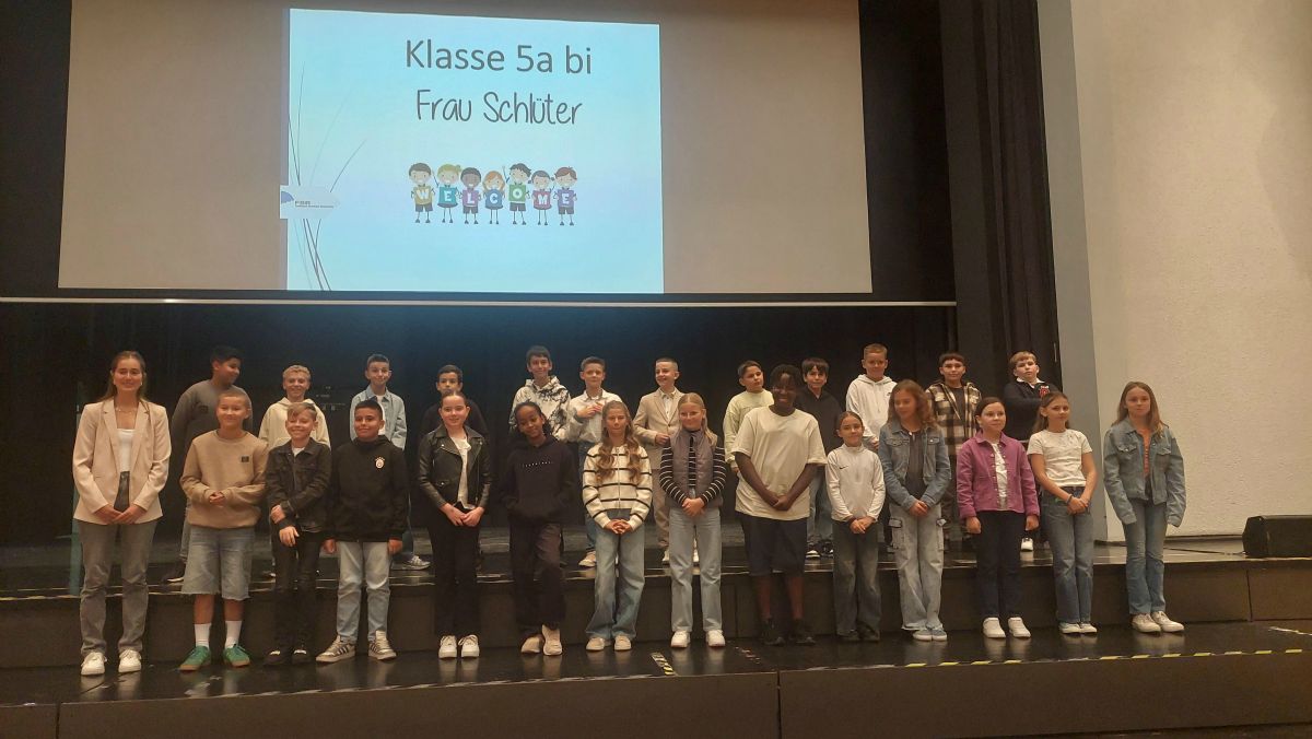 Die bilinguale Klasse 6a zeigte die englische Variante des Textes „Bärenjagd“ mit passenden Bewegungen unter der Leitung von Anneli Fily. Dann wurde es für die Neuen ernst: Die Kinder wurden klassenweise aufgerufen, mit ihrer Klassenlehrerin zum ersten Mal fotografiert und durften für ihre allererste Unterrichtsstunde die Stadthalle verlassen. Das Angebot des bilingualen Unterrichts wurde dieses Jahr besonders geschätzt, so dass zwei bilinguale Klassen (5a und 5b unter der Leitung von Swantje Schlüter und Ute Heinrichs) und eine normale Klasse (5c unter der Leitung von Dagmar Ennemoser) entstanden waren.