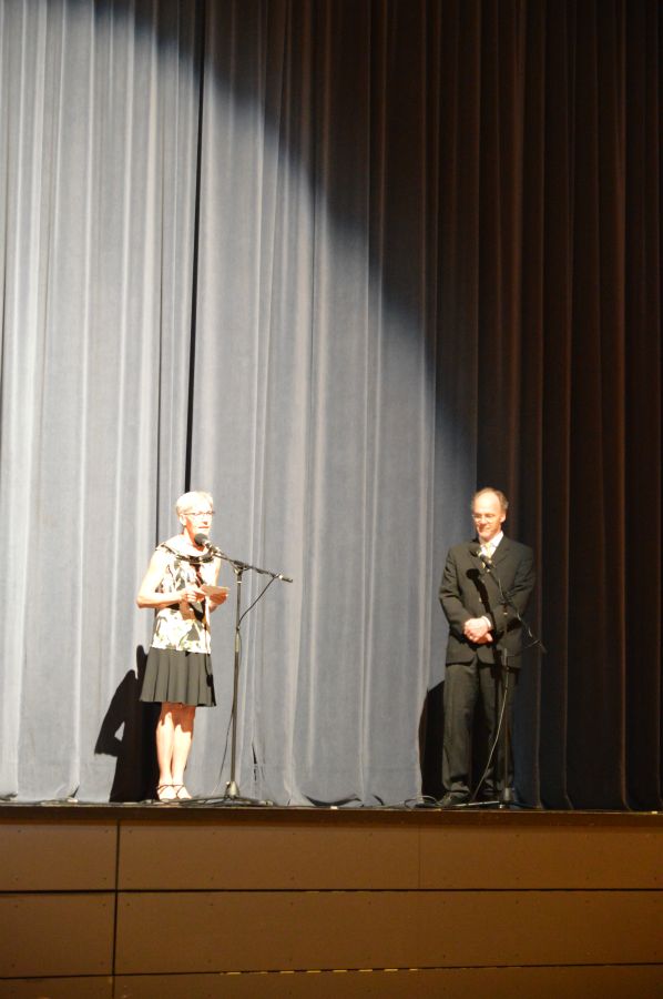 Das Publikum dankte mit begeistertem Beifall. Durch den Abend führten Schüler der Klassen 8c und 9a. Schüler aus den Klassen 6a, 6b und 9c bedienten das Mischpult. Für Sektempfang und Bewirtung sorgten Eltern und Schüler der Klassen 8d und 9b mit ihren Klassenlehrerinnen.