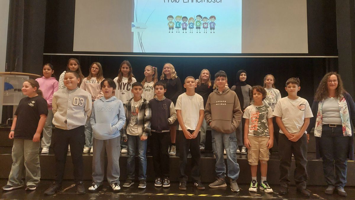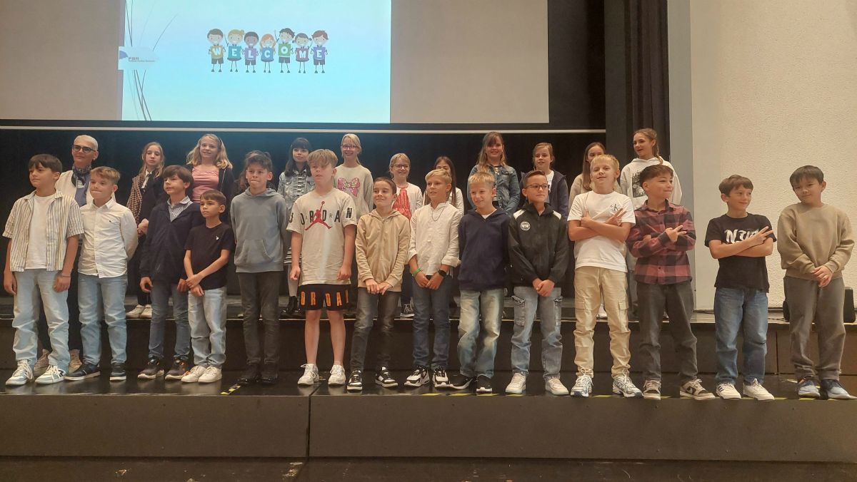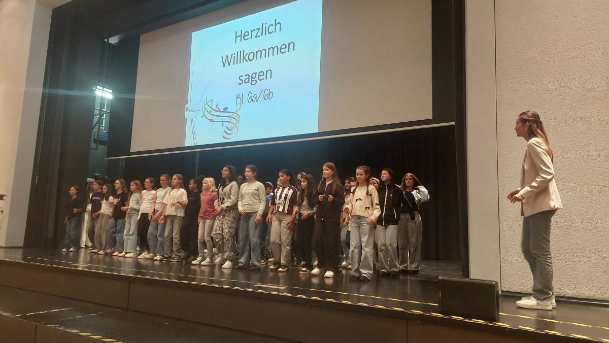 Viele erwartungsvolle und gespannte Gesichter konnte man an diesem Nachmittag in der Stadthalle beobachten. Während alle noch auf den offiziellen Beginn warteten, konnten die Neuankömmlinge schon den neuen Projektclip mit Musik anschauen. Das Gemurmel der Familien verstummte, als die sechsten Klassen unter der Leitung von Swantje Schlüter das Begrüßungsprogramm starteten.