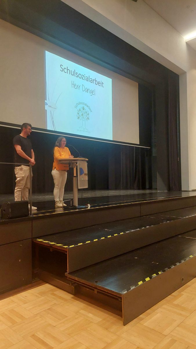 Im Anschluss daran zeigten die Sechser einen Linedance, einstudiert von Jean Pierre Brucker. Die beiden Schulsozialarbeiter Regina Wahl und Johannes Dangel begrüßten die 70 neuen Fünfer mit herzlichen Worten und stellten kurz die Schulsozialarbeit an der FSR vor.
