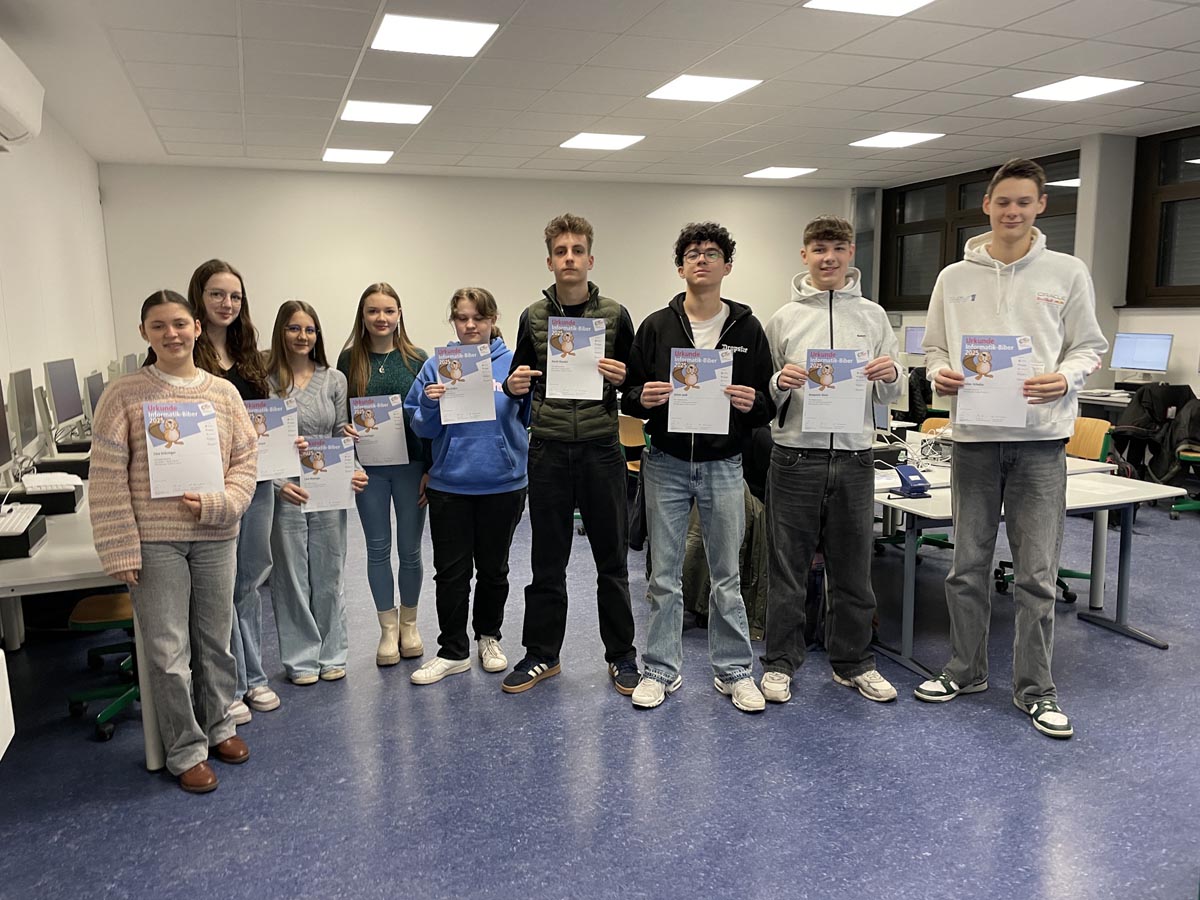 Zwei Schüler der FSR erzielten einen 3. Rang bei der Auswertung (Lisa Grözinger 10b, ganz links im Bild und David Wandel 10a, Bildmitte). Zudem gab es für besondere Leistungen eine Anerkennung und für alle Teilnehmerinnen und Teilnehmer eine Urkunde.